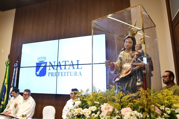A Prefeitura do Natal recebeu, na manhã desta segunda-feira, 10 de novembro, no Palácio Felipe Camarão, a imagem peregrina de Nossa Senhora da Apresentação, padroeira de Natal. O encontro foi marcado pela celebração da Santa Missa em ação de graças, presidida pelo Monsenhor José Valquimar, pároco da Catedral, e concelebrada pelos vigários paroquiais e pelo pároco da Antiga Catedral.