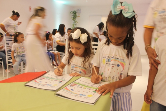 “Vou cantando, encantando e assim vou construindo entre letras e desenhos” foi o tema da Tarde de Autógrafos do CMEI Dr. Vulpiano Cavalcanti de Araújo, localizado no bairro de Igapó, envolvendo cerca de 60 alunos que concluíram a etapa da Educação Infantil e ingressam em 2023 no Ensino Fundamental. O evento foi realizado em um salão de festas localizado no bairro da unidade de ensino e reuniu toda comunidade escolar.