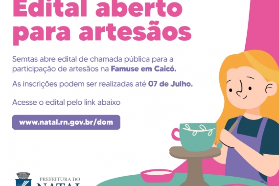 O edital para selecionar artesãos que irão participar da 38ª Famuse, foi aberto pela Secretaria Municipal do Trabalho e Assistência Social (Semtas), por meio do Departamento de Gestão Empreendedora, Artesanato e Economia Solidária. A Feira de Artesanato dos Municípios do Seridó (Femuse), acontece entre os dias 26 e 30 de julho, em Caicó – RN. A iniciativa da Prefeitura é apoiar os artesãos na divulgação, exposição e comercialização dos seus produtos em várias feiras que acontecem pelo Rio Grande do Norte e Nordeste.