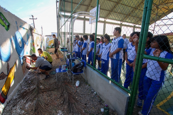 Os estudantes observaram de perto a criação artística e a técnica do grafite. "Os desenhos estão deixando ainda mais legal a nossa quadra", destacou Jaylon Nascimento da Silva, de 12 anos e estudantes do 5º ano. Já a estudante Darlyane Samara Santos de Sousa, de 10 anos, da mesma turma comentou: "Achei muito lindo. Observei que o pessoal estava fazendo tudo com cuidado e atenção".